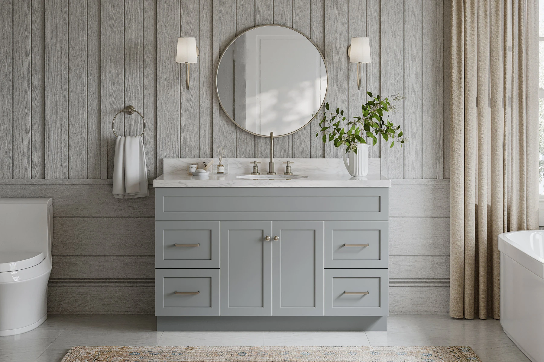 This vanity features a 72 Inches solid wood cabinet with brushed nickel finish hardware on the drawers and cabinet doors, adding a touch of class and durability to your bathroom. This fully assembled vanity effortlessly enhances medium to large bathrooms or master suites, instantly elevating their aesthetic appeal.