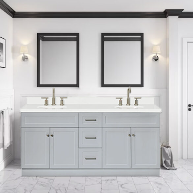 Vanities brings you a contemporary and chic bathroom vanity that will elevate your bathroom design. This vanity boasts a 60 Inches base cabinet with shaker style doors and flat panel drawers, crafted from solid wood and finished with brushed nickel hardware.